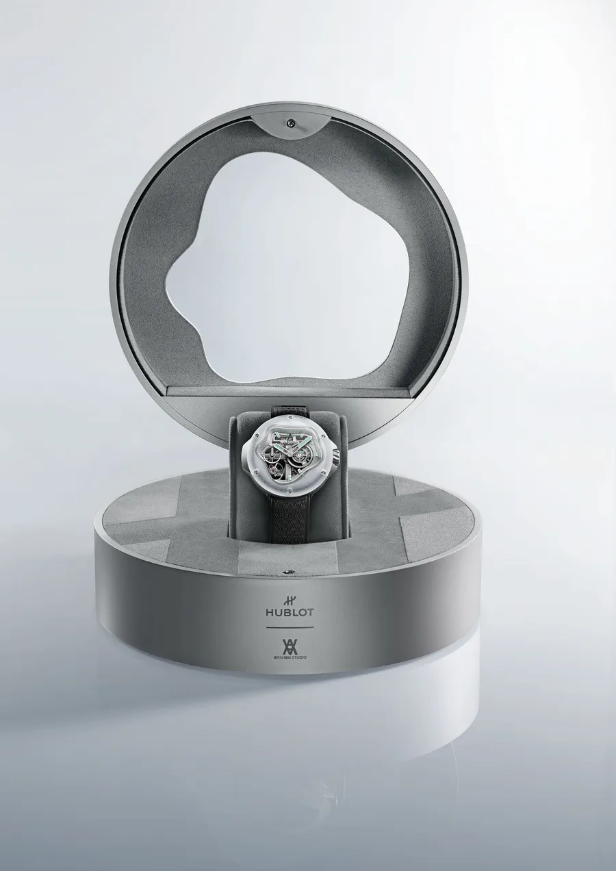 Новые часы — это первая наручная модель Аршама, созданная им специально для Hublot. Компактный корпус диаметром 42 мм выполнен из титана и сапфира, что позволило объединить изящество скульптуры и высокотехнологичную механику. Механизм Hublot Meca-10 с ручным заводом можно рассмотреть сквозь прозрачное сапфировое стекло и заднюю крышку.