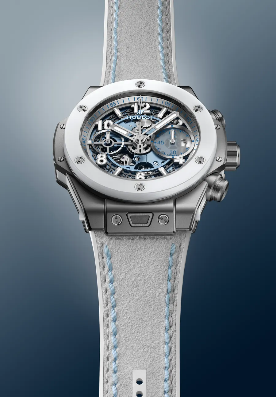 Следуя своей традиции создавать сезонные версии культовых моделей Big Bang Unico, Hublot представил часы в холодных оттенках — прозрачном сапфире и сочетании титана с белой керамикой. Обе модели получили корпус диаметром 42 мм и уникальный ротор в форме снежинки, который можно увидеть через заднюю крышку.