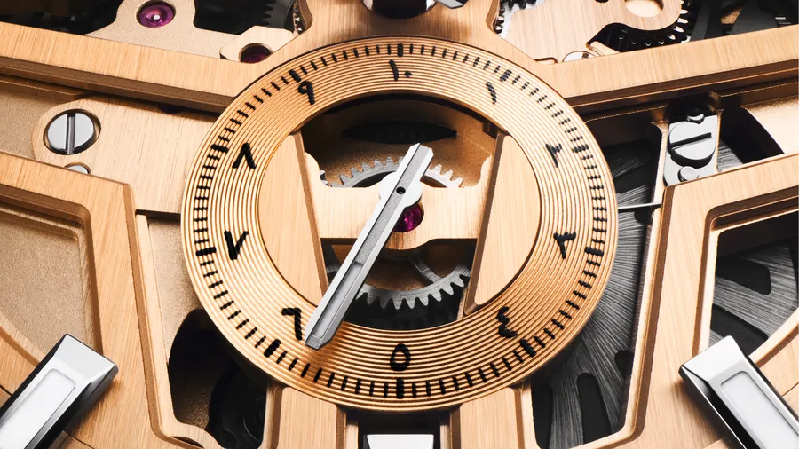 Дизайн часов перекликается с архитектурной эстетикой ближневосточных мегаполисов — чистые углы, вертикальная устремленность и широкие горизонты, где свет формирует каждую линию. Взаимодействие золота и стали на скелетонизированном циферблате со звездным узором отражает баланс структуры и открытости.