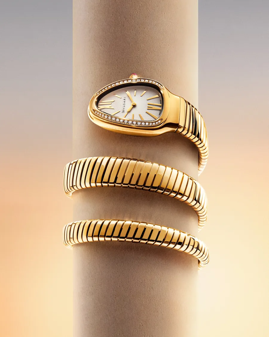 Новые изделия выполнены из желтого и белого золота и отражают две стороны Serpenti: наследие и постоянную эволюцию. Модульные звенья формируют гибкий, почти «второй кожей» облегающий силуэт, обеспечивая баланс между культовым дизайном и комфортом.