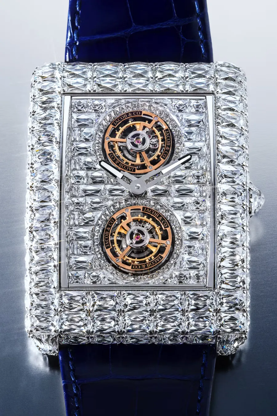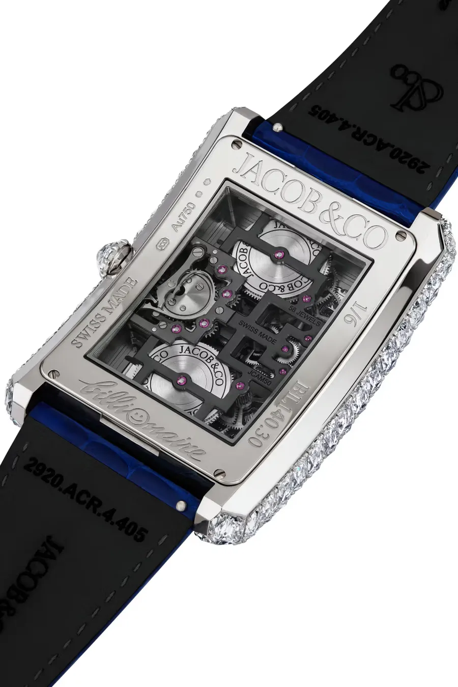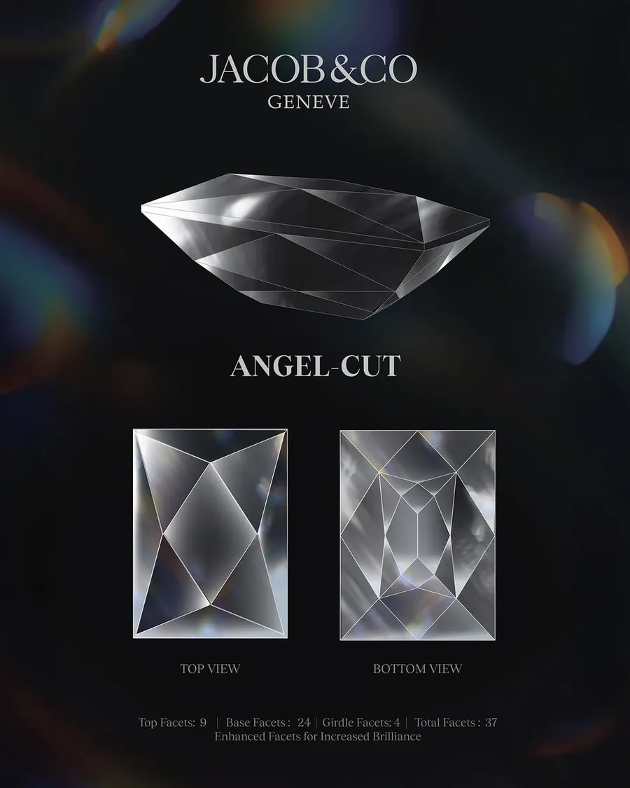 В честь 40-летнего юбилея бренда Jacob & Co. представила инновационную модель Billionaire Double Tourbillon Angel Cut, которая демонстрирует новый запатентованный алмазный огранок Angel Cut, разработанный внутри компании.
