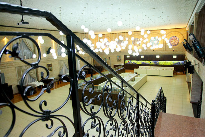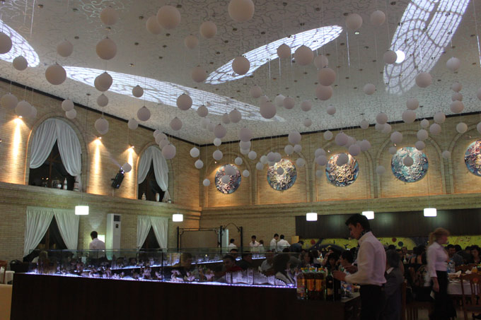 Через вторые внушительные деревянные двери проходим в банкетный зал. Пожалуй, это один из самых красивых и элегантных среди ресторанов Ташкента. Смешение восточного колорита и европейской элегантности. Превалирует несколько основных цветов: песочный, оттенки серого, молочный, белый. Их разбавляют цветные пятна огромных панно на стене напротив входа — работы молодых узбекских художников. Но в первые моменты не они притягивают взор, а два наиболее примечательных элемента: 135 белых шаров-светильников, свисающих с семиметровой высоты узорчатого потолка, и длинный караван с верблюдами, слонами и их погонщиками, идущий вдоль великого шелкового пути по песчаной пустыне. Разглядывать эти миниатюрные глиняные фигурки можно часами, угадывая игрушечные копии известных архитектурных памятников, относящихся к всемирному наследию.