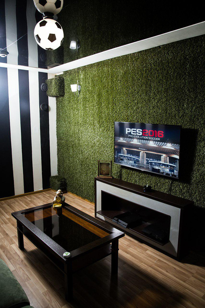Каждая кабинка уникальна и отличается от других необычным дизайном. Хайтек лег в основу оформления первой комнаты — здесь все крутится вокруг технологий: стильно и брутально. Поклонники футбола оценят комнату №2. В этом зеленом мини-зале комфортно будут себя чувствовать 5-7 болельщиков, но можно собрать и целую команду — остальные разместятся на пуфиках.