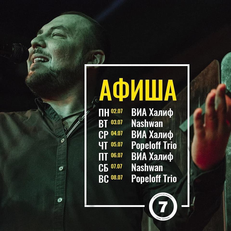Бар «7 Пятниц» приглашает посетителей на вечеринки. Гостей ждут живые выступления групп Nashwan, Popeloff Trio, Виа "Халиф".