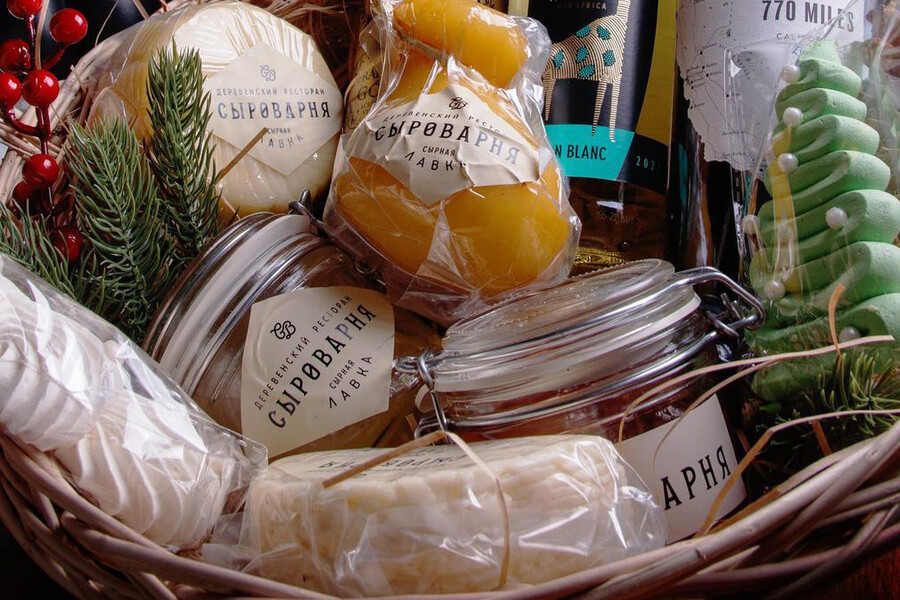 Деревенский ресторан подготовил для любителей сыров новогодние наборы. Внутри коробок и корзин — фирменные сыры, оливковое масло и конфитюр. Таким набором можно порадовать близких людей вне зависимости от пола и возраста и не переживать за актуальность. Поскольку он станет отличной альтернативой конфетам и займет почетное место на новогоднем столе.