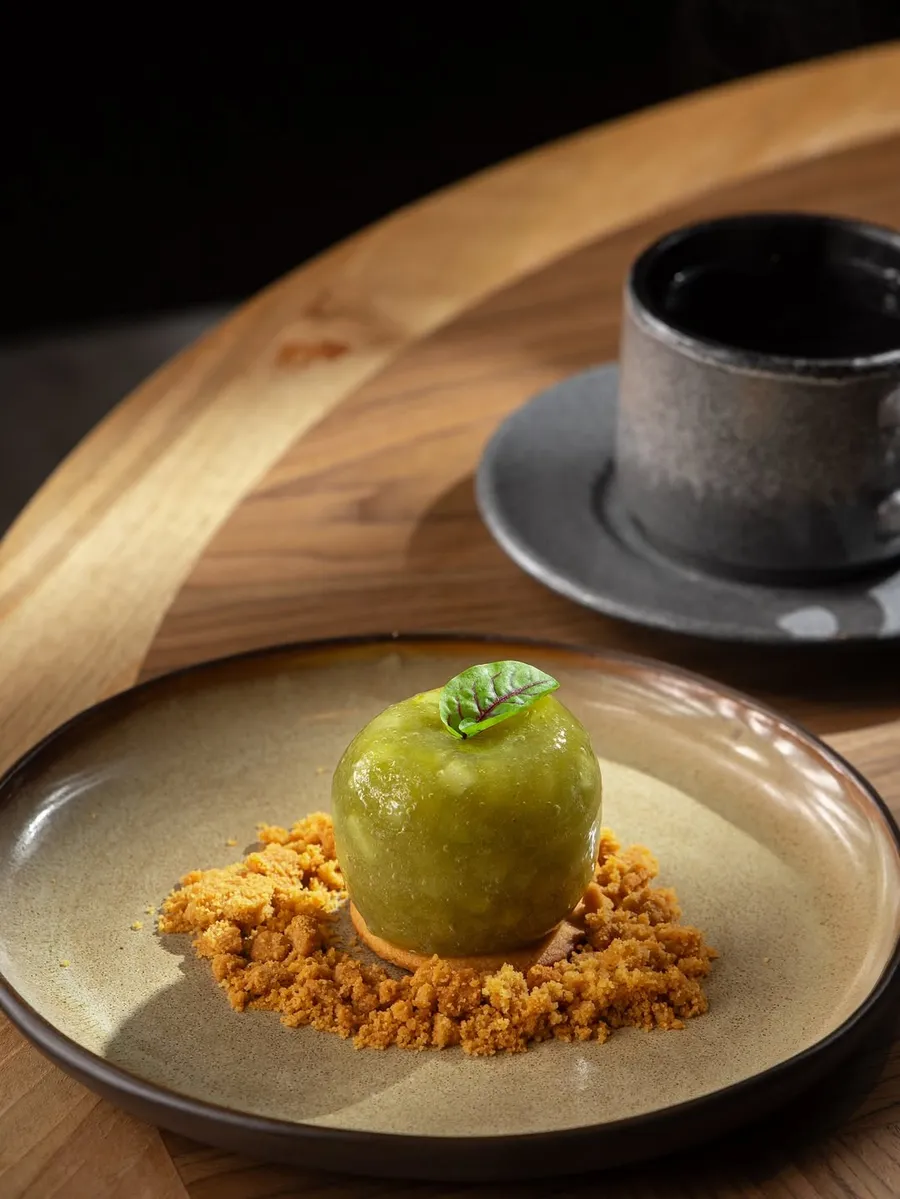 Завершением фестивального меню стал квапён. Вместо привычной желирующей текстуры здесь подают холодный десерт, в основе которого — кусочки запеченного яблока. Десерт оформлен в виде яблока и подается на подложке из хрустящего печенья, которое создает приятный контраст.
