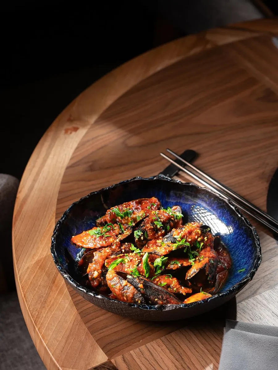 После супа подали мидии в томатном соусе. Это блюдо стало шагом в сторону современной сеульской гастрономии, где корейская любовь к морепродуктам соединяется с европейскими подходами к соусам.