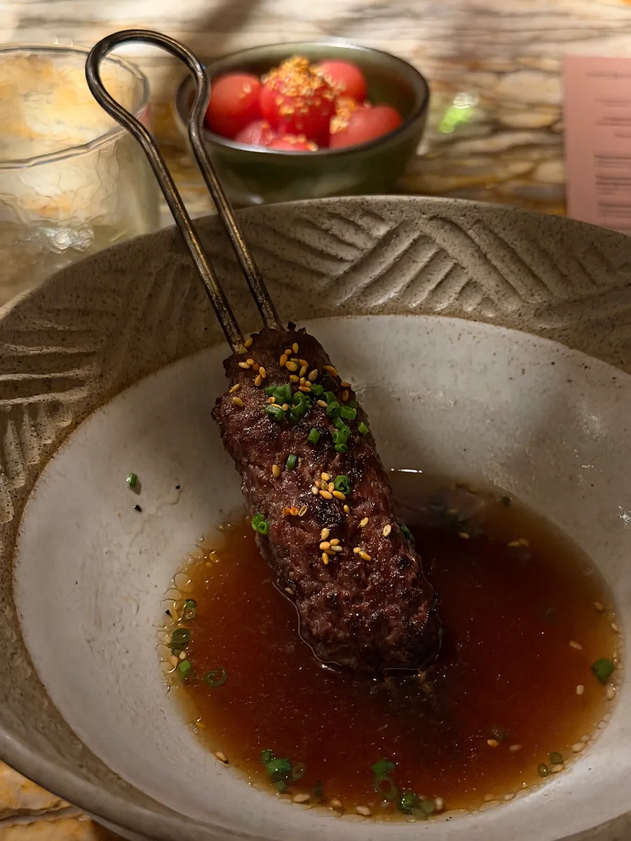 Далее мы познакомились с шашлычками из рибая сухого вызревания (127 000 сумов). Это мясо с нежной жировой прослойкой, подрумяненное на огне и дополненное сладким соусом на основе сои и сакэ. Сочно, аппетитно, ярко по вкусу.