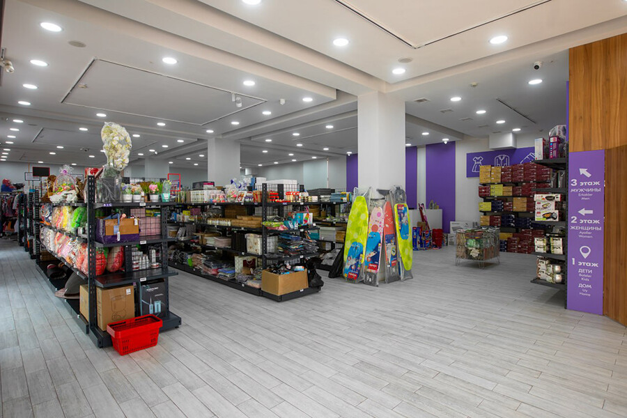В трехэтажном магазине имеется большой ассортимент товаров: начиная с одежды и аксессуаров, заканчивая игрушками для детей и товарами для дома.