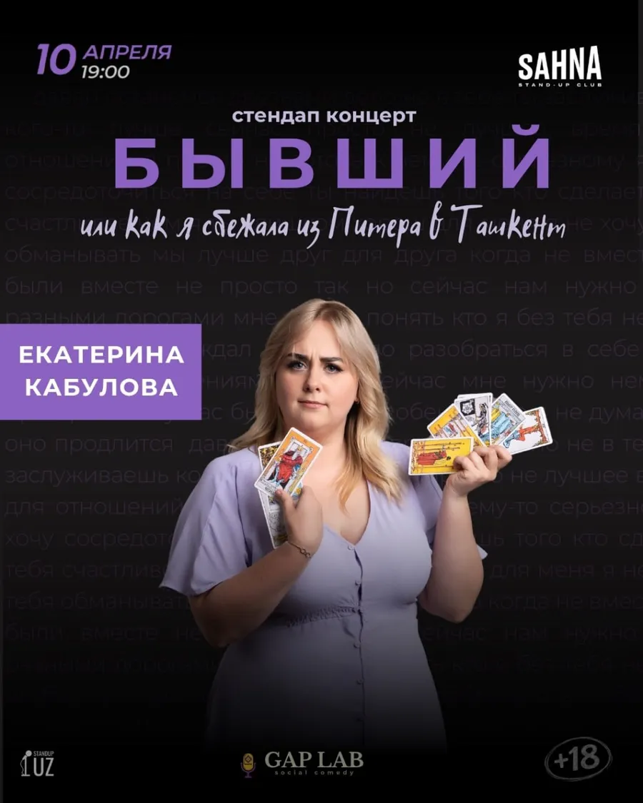 Сольный концерт Екатерины Кабуловой «Бывший». Это честная, острая, злободневная и смешная история о том, что происходит после расставания. Девушки обычно стригут каре, покупают абонемент в зал, скачивают Tinder и быстро разочаровываются, слушают ANNA ASTI и уходят в загулы. Екатерина прошла через всё это и даже больше: попала в Книгу рекордов России, оказалась на атомной станции в Бангладеше, переехала в Ташкент и вышла замуж за узбека. Так родилась уникальная история, которая стала основой её стендап-концерта.