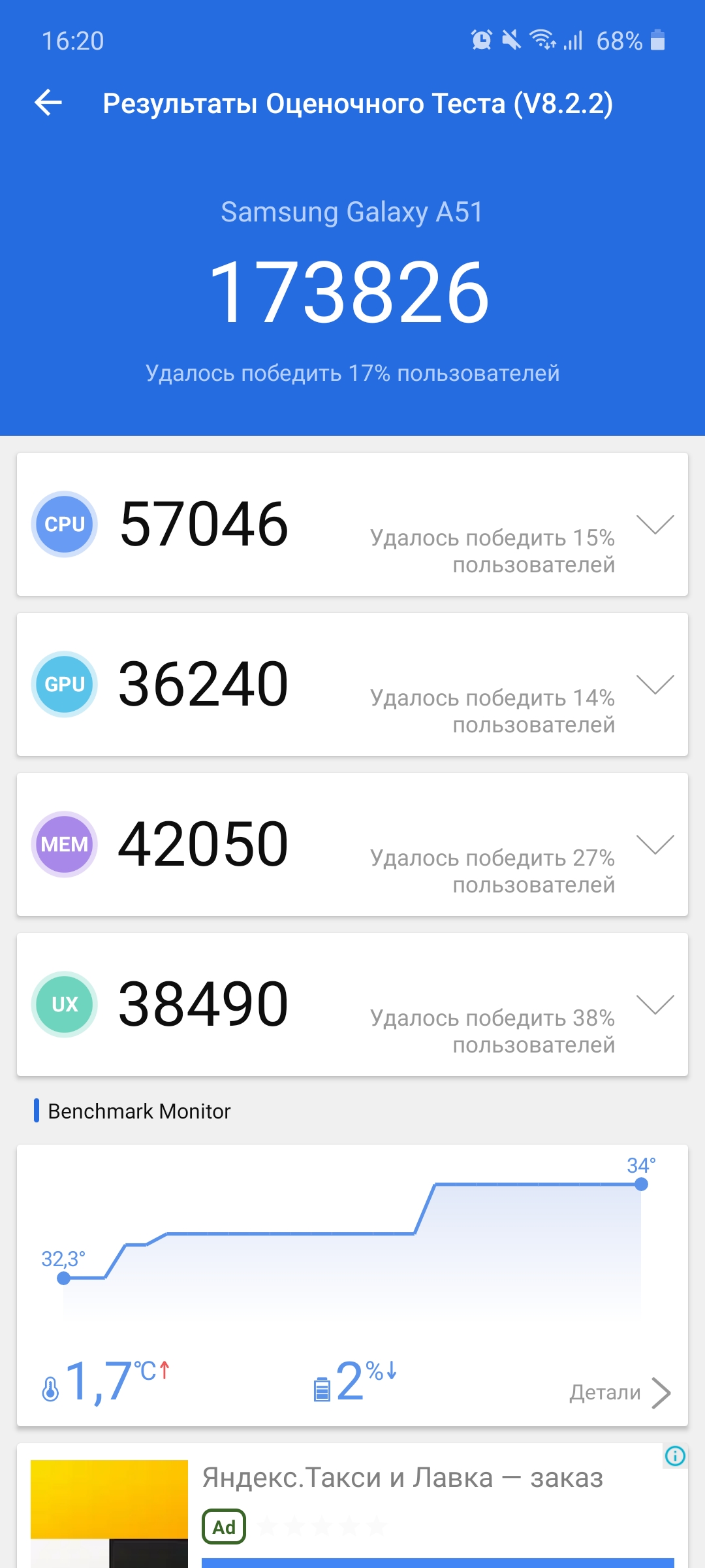 Памяти оперативной 4 Гб, а встроенной 64 или 128 Гб. Поначалу думал, 4 Гб оперативки мне может не хватить, но в итоге оказалось, что оптимизация оболочки и использование процессора Exynos 9611 положительно сказались на скорости интерфейса и его восприятии в целом. В AnTuTu герой нашего обзора уверенно набирает больше 170 000 баллов.
