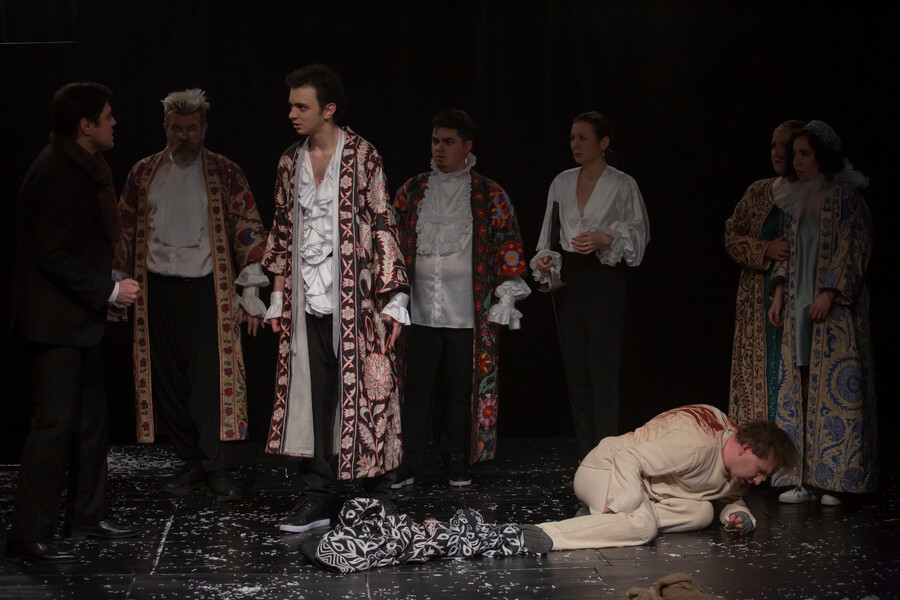 Художница по костюмам Азиза Кадыри одевает актеров в азиатские яркие халаты, а актер Глеб Голендер придумал маски в стиле комедии дель-арте, смешивая стили и эпохи. Пестроту костюмов подчеркивают аскетические декорации. Прямо перед зрителями первого ряда поставлен стол со стулом и лампой, которая обязательно будет высвечивать кому-то из персонажей в лицо, как на допросе.