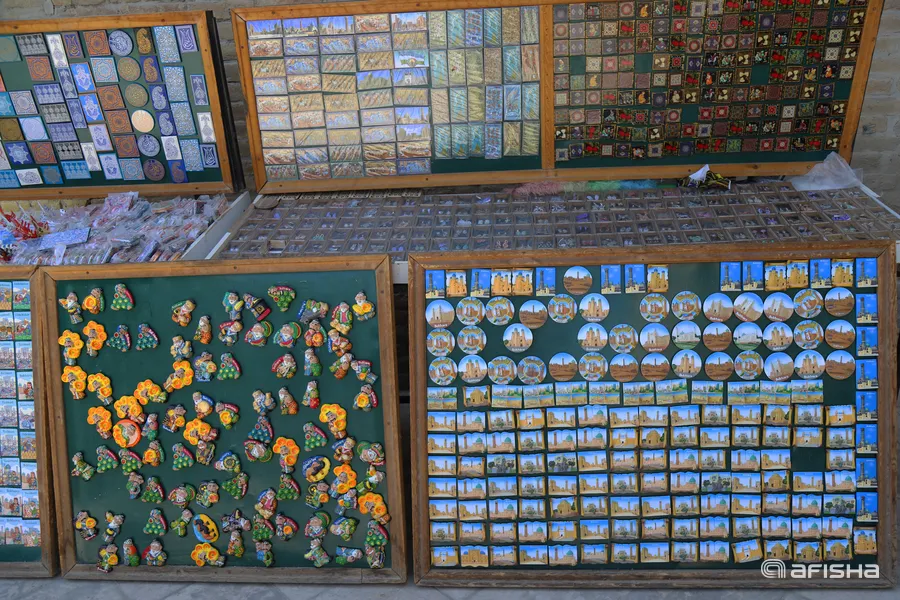 Продавец Саидбек Рахмонов делится: «Обычно цена — 15−20 тысяч сумов. Туристы любят магниты ручной работы и с изображениями исторических памятников. В день продаем около 50 штук, а в сезон — до 200».