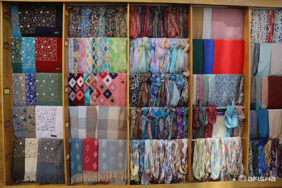 На прилавках легко найти шарфы с цветочным орнаментом, геометрией или классическим ярким адрасом — легким, пестрым и узнаваемым.
