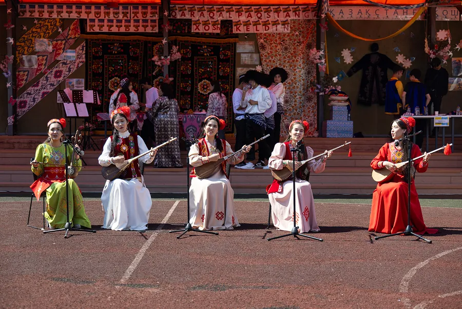 Гостей встречали живая национальная музыка, артисты и праздничная атмосфера весеннего обновления. Уже с первых шагов было ощущение, что это не просто школьное мероприятие, а полноценный городской фестиваль. Программа началась с официального открытия и приветственных слов руководства школы, после чего сцена была передана главным героям дня — студентам.