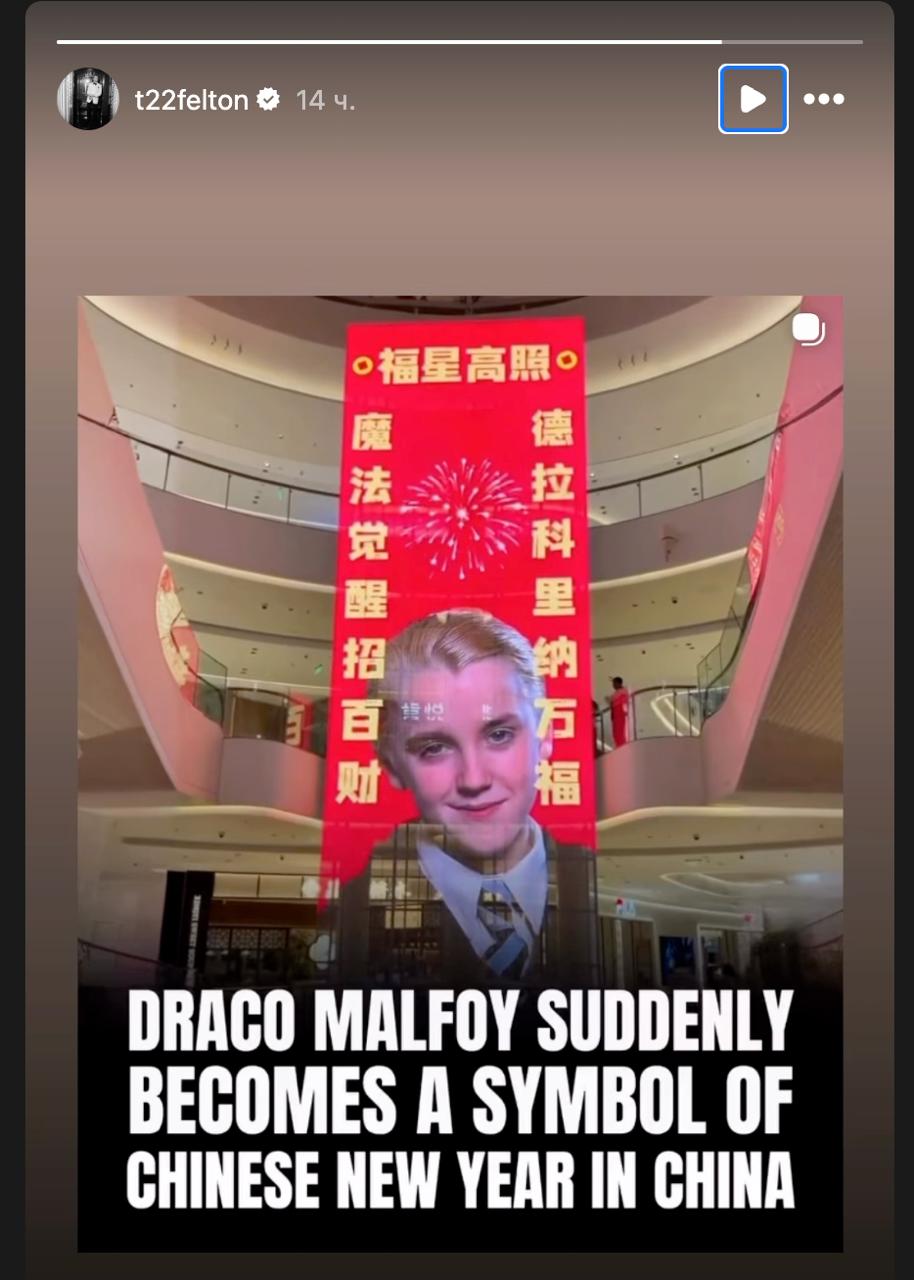 Trend aktyor Tom Feltonning ham e’tiboridan chetda qolmadi. U Drako Malfoy Xitoy Yangi yilining ramziga aylangani haqidagi Instagram storis joylagan.
