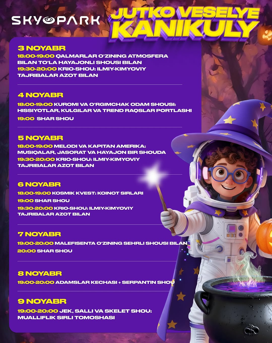 Sky Park bolalar va ota-onalarni kuzgi ta’tilni bayramona shoulardan zavqlanib oʻtkazishga taklif qiladi.