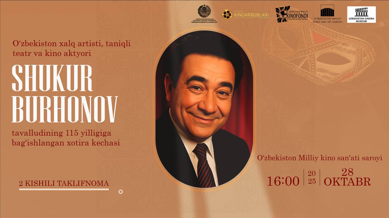 Milliy kino sanʼati saroyida O‘zbekiston xalq artisti, taniqli teatr va kino aktyori, Shukur Burhonov tavalludining 115 yilligi munosabati bilan xotira kechasi boʻlib oʻtadi.
