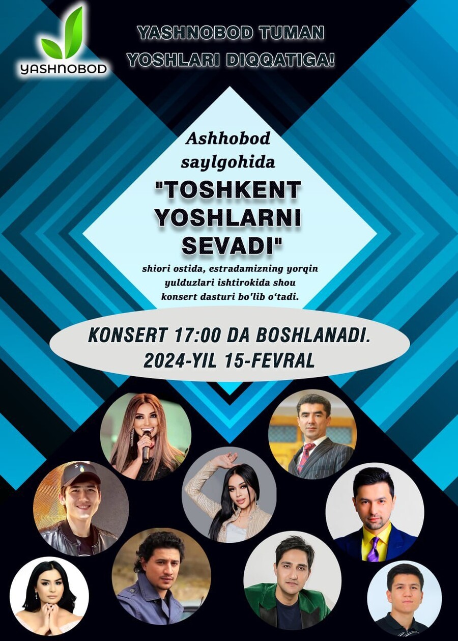 “Ashxobod” sayilgohida “Toshkent yoshlarni sevadi” shiori ostida yulduz san’atkorlar ishtirokida shou konsert dasturi bo‘lib o‘tadi.