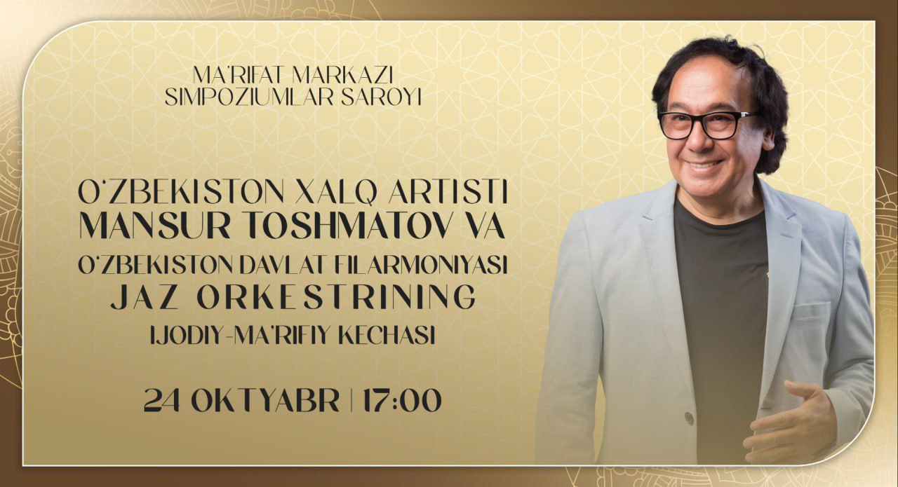 “Ma'rifat markazi” Simpoziumlar saroyida O‘zbekiston xalq artisti Mansur Toshmatov hamda Davlat Jaz orkestrining ijodiy-ma'rifiy kecha konserti bo‘lib o‘tadi.