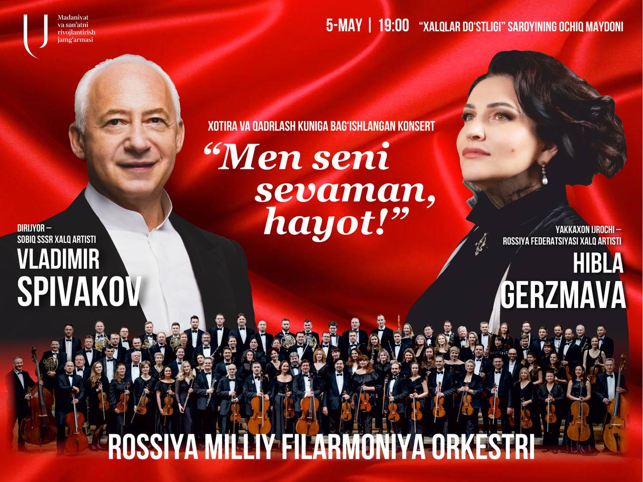“Xalqlar doʻstligi” saroyining ochiq maydonida Xotira va Qadrlash kuniga bag‘ishlangan dirijyor Vladimir Spivakov hamda Rossiya Federatsiyasining Xalq artisti Hibla Gerzmavaning “Men seni sevaman, hayot!” nomli konsert dasturi boʻlib oʻtadi.