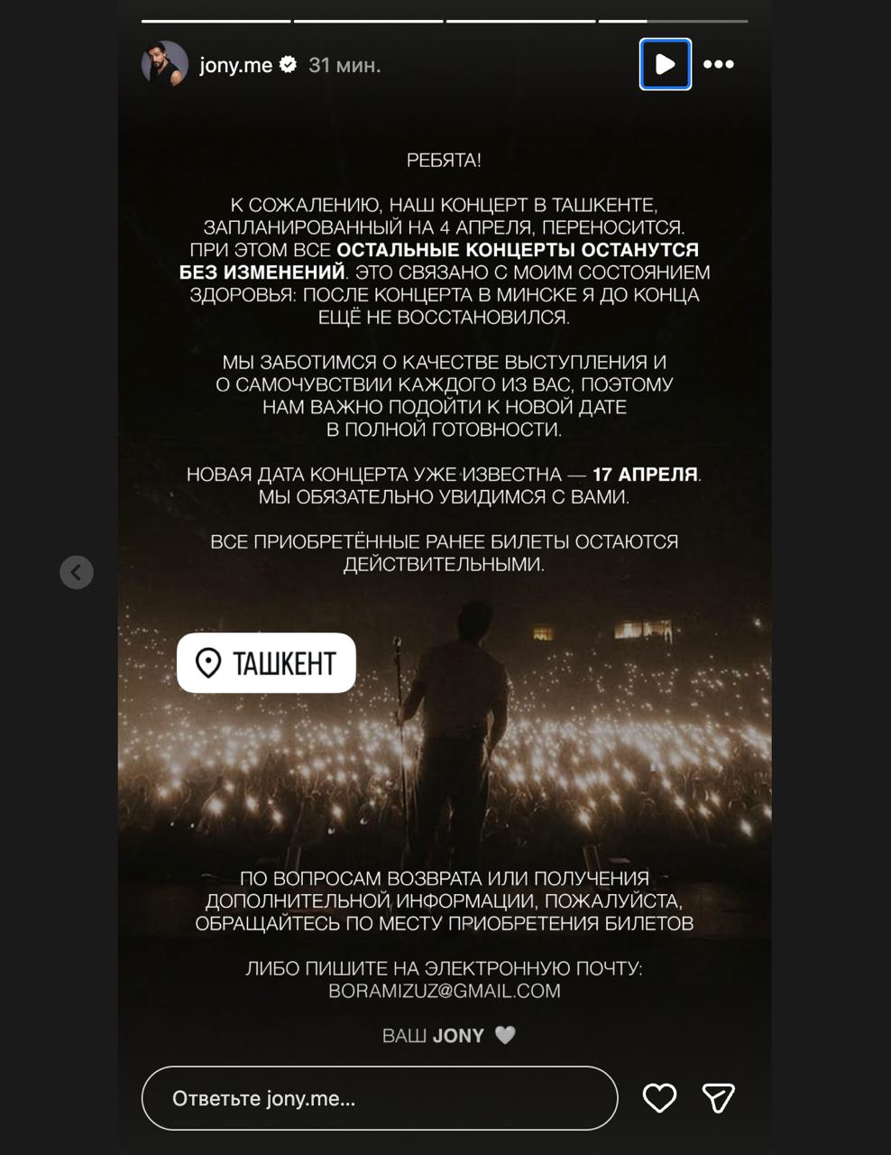 Toshkentda 4-aprel kuni o‘tkazilishi rejalashtirilgan Jony’ning konserti boshqa sanaga ko‘chirildi. Bu haqda xonanda o‘zining Instagram sahifasi orqali ma’lum qildi.