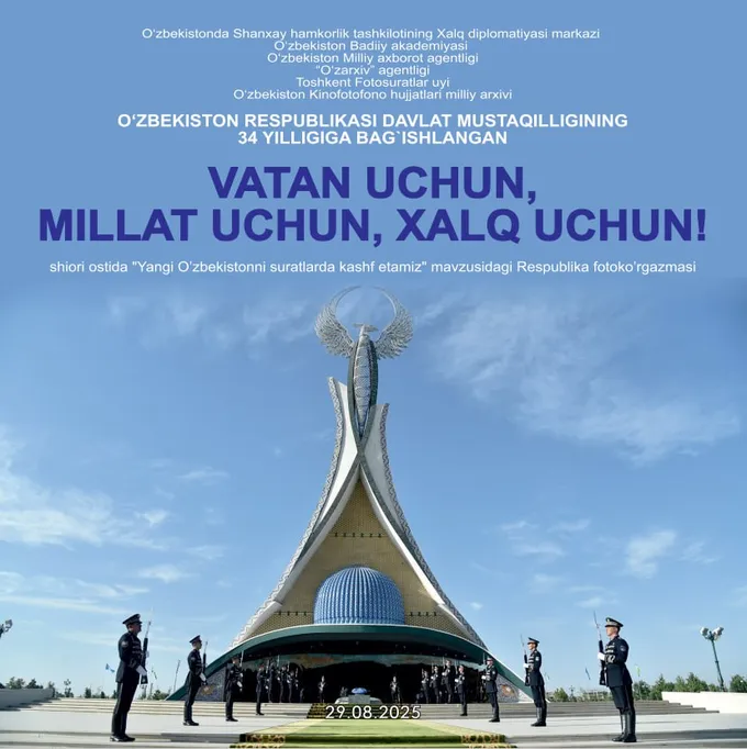 Toshkent fotosuratlar uyida “Vatan uchun, millat uchun, xalq uchun!” shiori ostida “Yangi O‘zbekistonni suratlarda kashf etamiz” Respublika fotoko‘rgazmasi ochilmoqda. Ko‘rgazma O‘zbekiston Mustaqilligining 34 yilligiga bag‘ishlanadi.