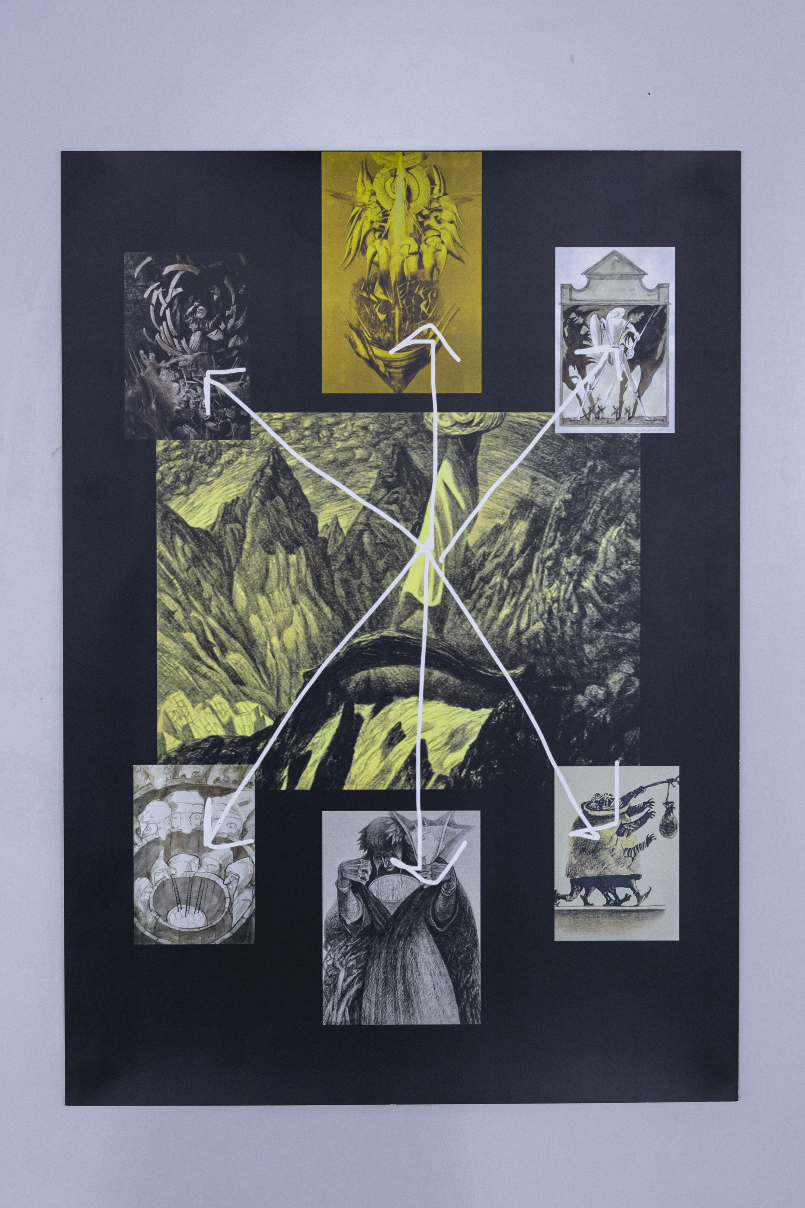 Ekspozitsiyadagi suratlar mashhur asarlar nomi bilan nomlanmagan. Ko‘rgazmaning markazida vertikal joylashtirilgan uch asar: yuqorida Dantening “Ilohiy komediya"sidagi Qiyomat manzarasi, pastda esa o‘z ongidagi jahannamga boqayotgan Dante siymosi. Ularning orasida — Fann tog‘lari fonida non solingan savatni boshida ko‘tarib, jarlik ustidagi yog‘ochdan o‘tayotgan qiz. Bu obrazlar inson tanlovining ramziy ifodasi sifatida talqin etiladi.