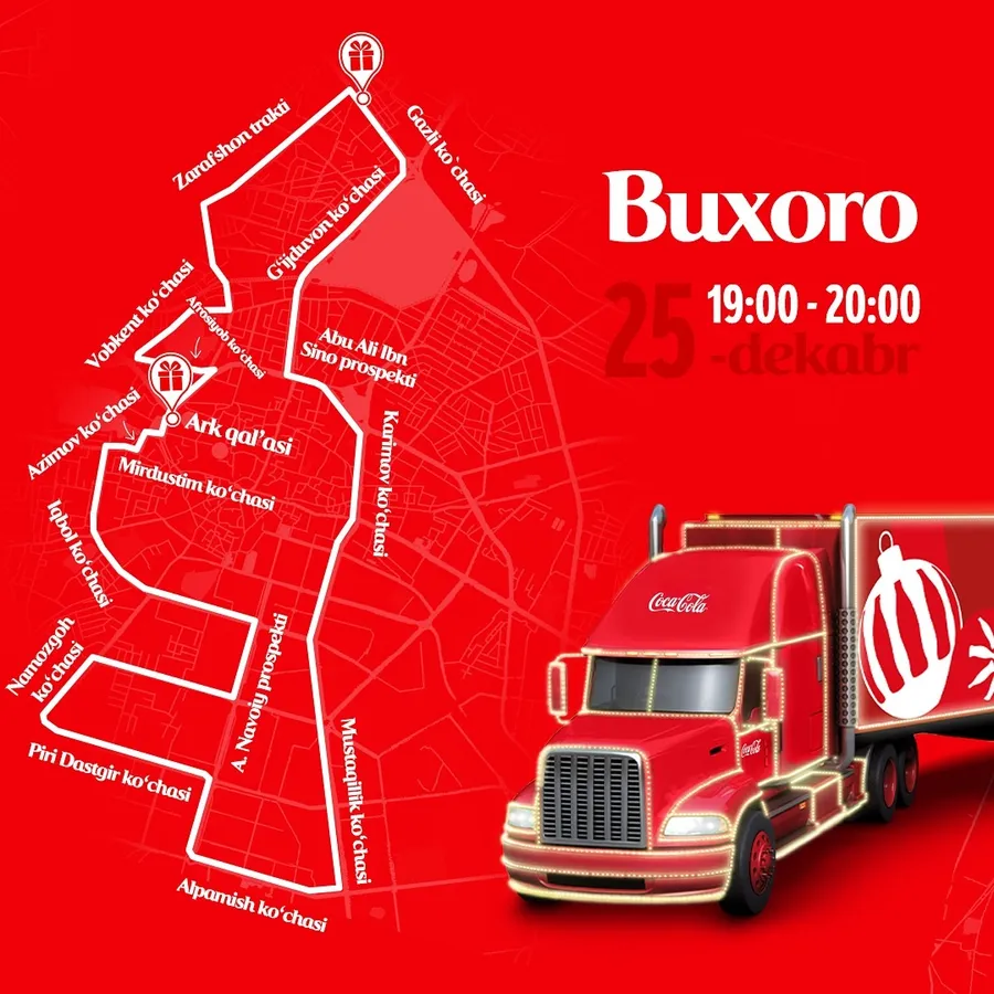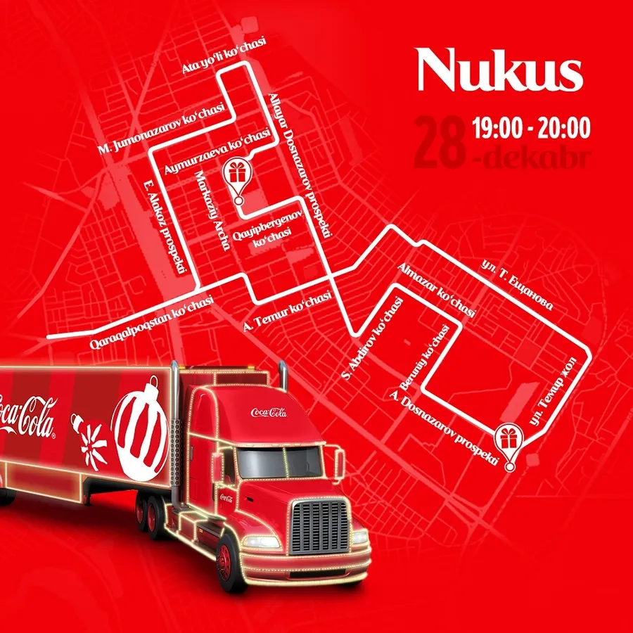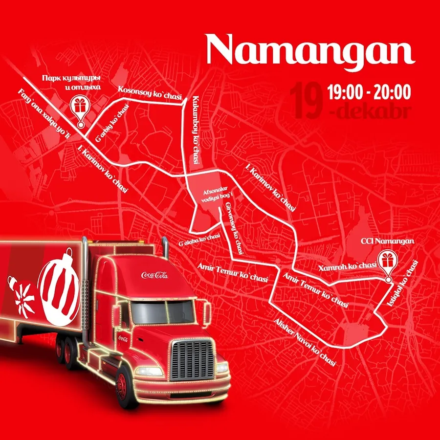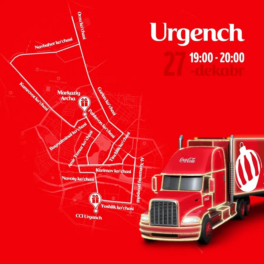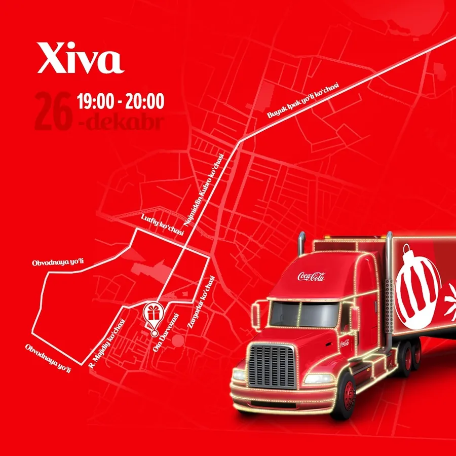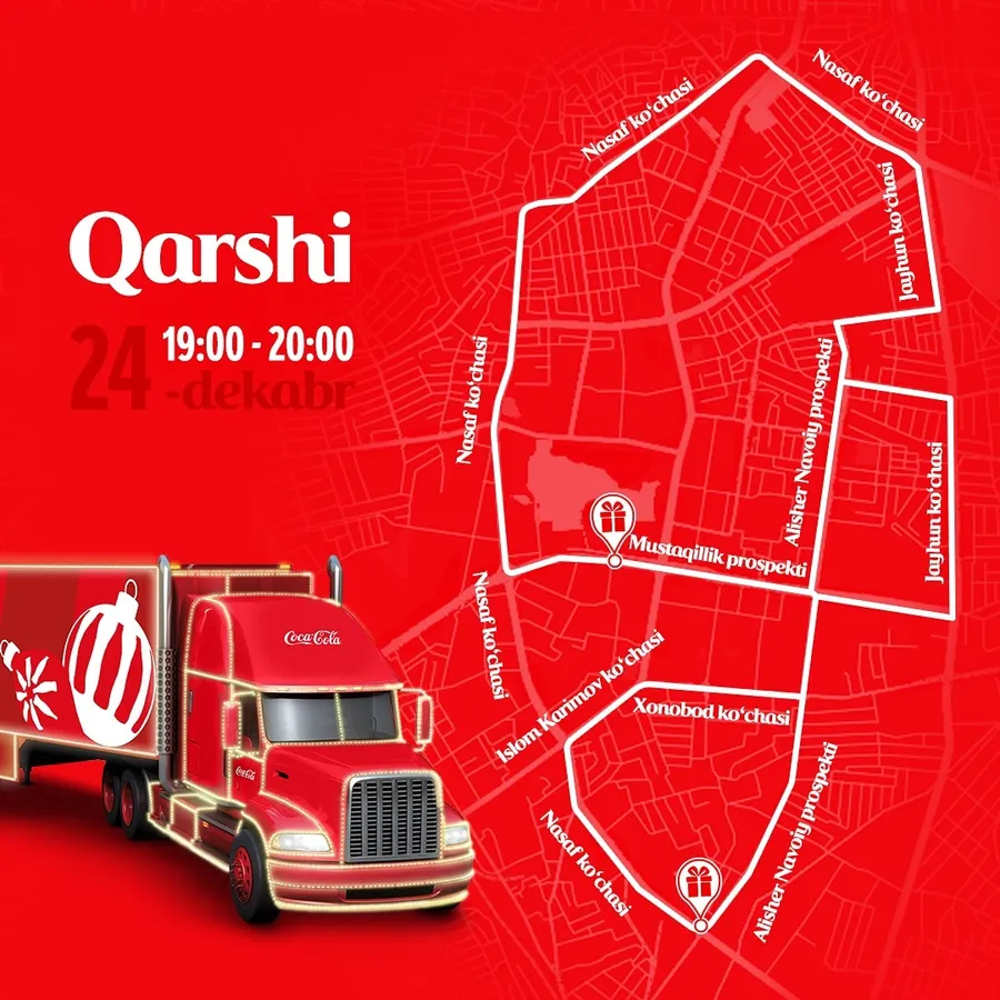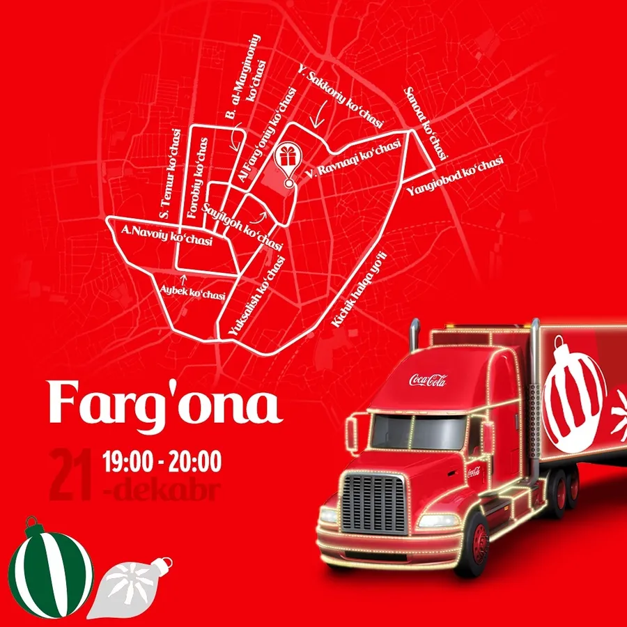 19-dekabrdan boshlab Coca-Cola yuk mashinalarining bayramona Yangi yil karvoni O‘zbekistonning bir qancha shaharlari bo‘ylab sayohatini boshlaydi. Ushbu karvonning marshrutlar va sanalar e’lon qilindi.