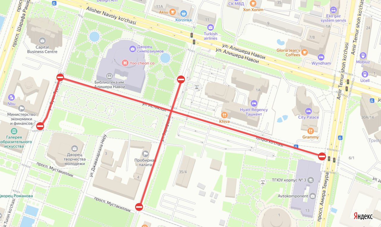 Qayd etilishicha, cheklovlar ikki hududda — Milliy kutubxona oldidagi maydon atrofida hamda Taras Shevchenko nomidagi gastronomik-turistik ko‘cha hududida joriy etiladi. Haydovchilarga yo‘l harakatidagi o‘zgarishlarni inobatga olgan holda harakat yo‘nalishlarini oldindan rejalashtirish tavsiya etildi.