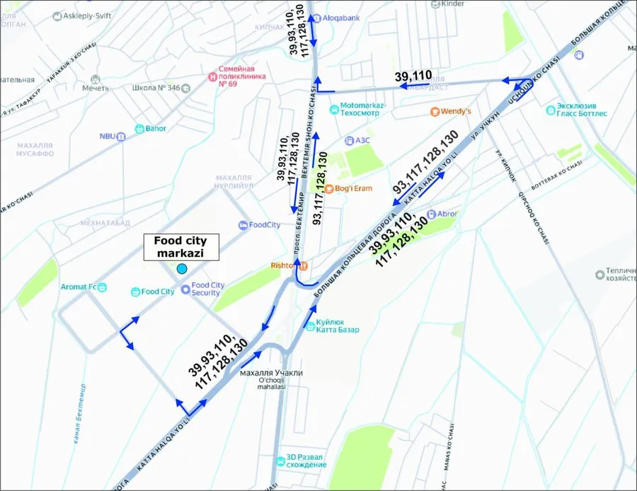 - 93, 117, 128 va 130-sonli avtobuslar Katta halqa yoʻli va Furqat koʻchasi kesishmasida buriladi;