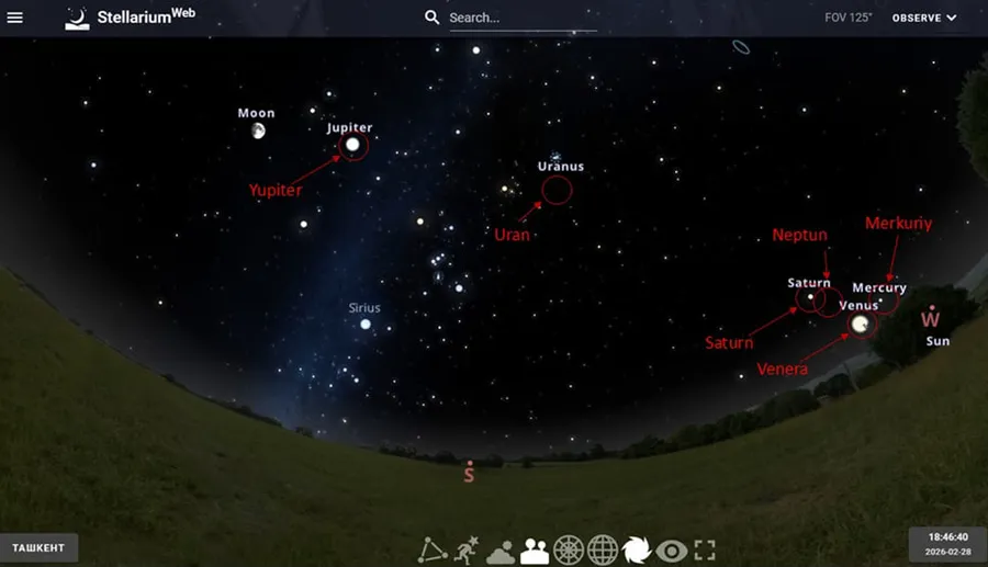 O‘zbekiston Respublikasi Fanlar akademiyasi Astronomiya instituti xabariga ko‘ra, 2026-yil 28-fevral kuni O‘zbekiston osmonida noyob astronomik hodisa boʻlgan sayyoralar paradi kuzatiladi.