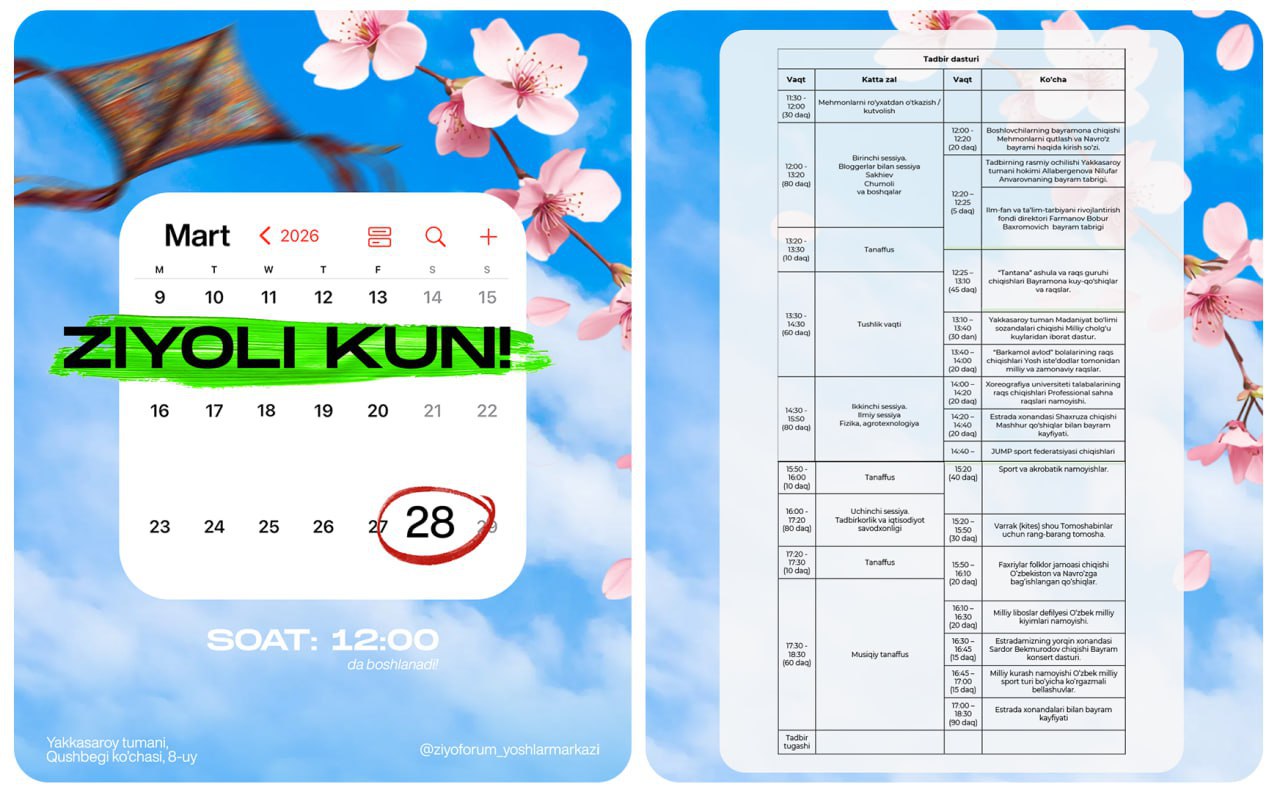 “Ziyo Forum” Yoshlar markazida “Ziyoli kun — Navro‘z” festivali bo‘lib o‘tadi.