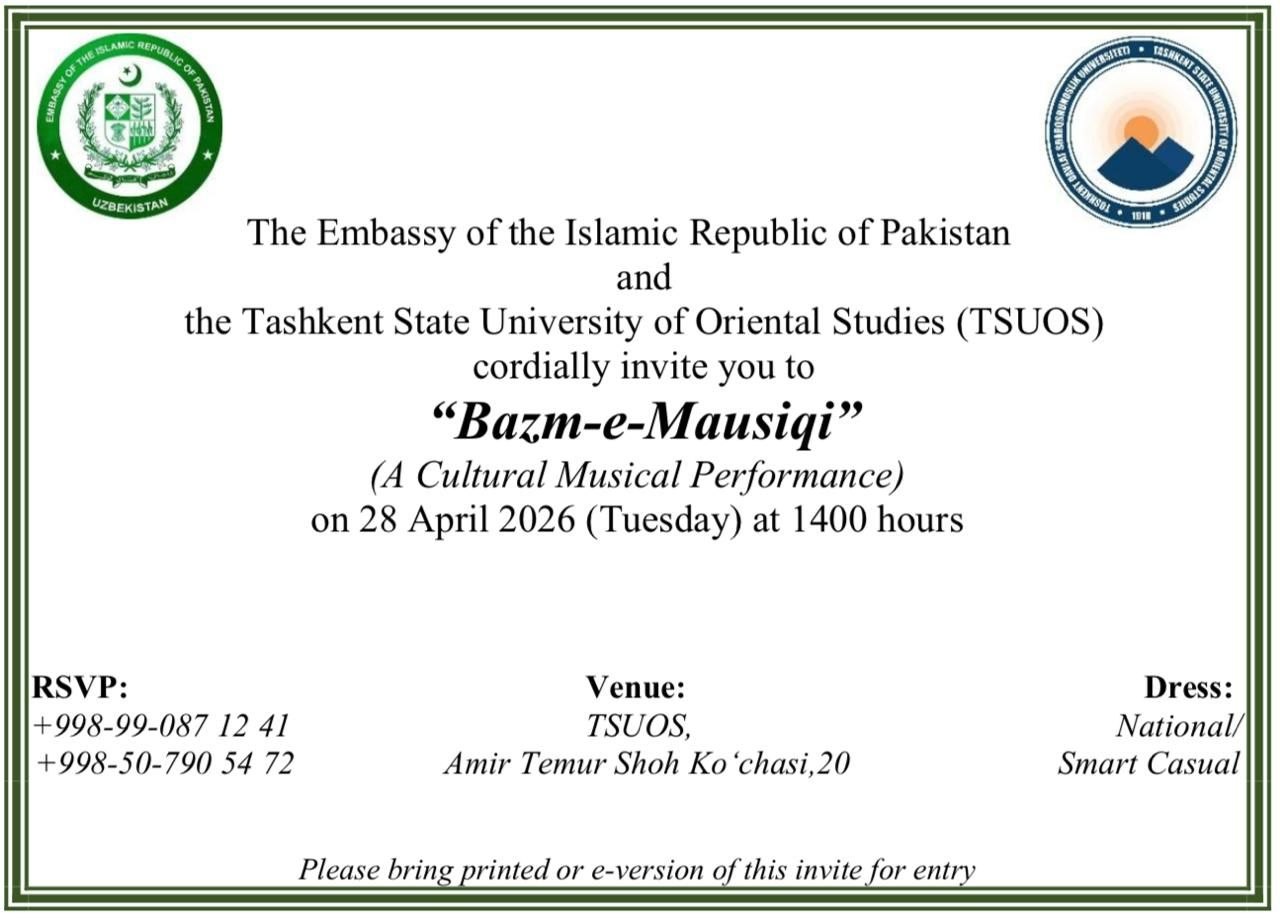 Toshkent davlat sharqshunoslik universitetida Pokiston Oʻzbekistondagi elchixonasi bilan hamkorlikda Bazm-e-Mausiqi nomli musiqiy va madaniy tadbir boʻlib oʻtadi.