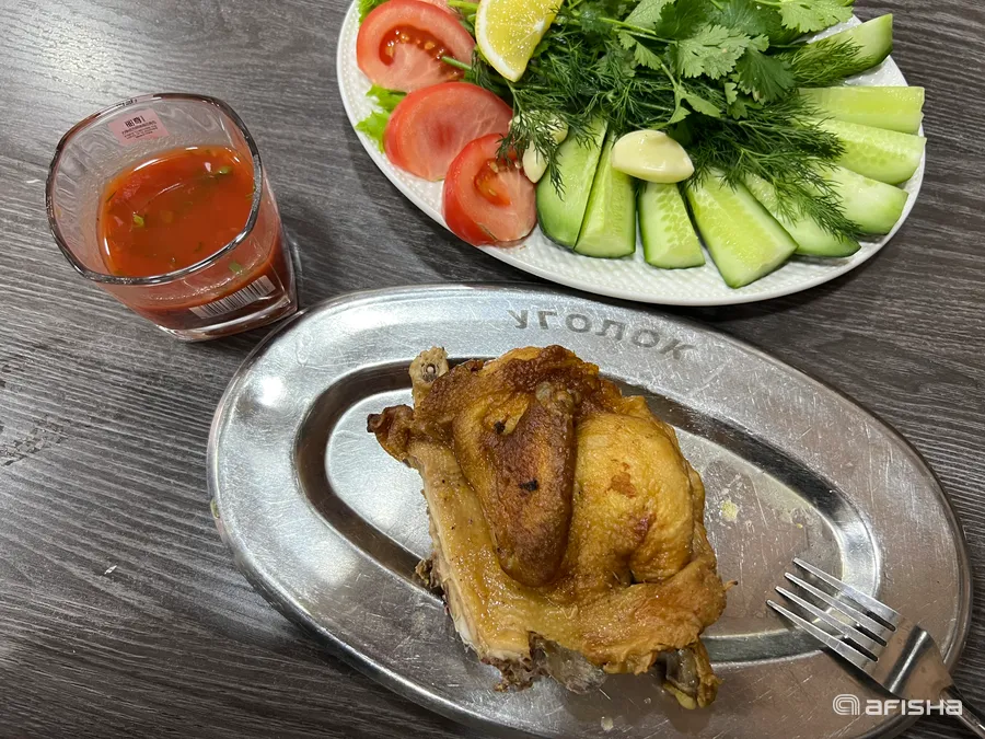 Kafeda faqat tovuq pishiriladi. Bir porsiya taom narxi — 35 000 soʻm. Shuningdek, tabaka yoniga non, pomidori soki va salat taklif etiladi. “Ugolok"da ovqatlanish bir kishi uchun oʻrtacha 50 000 soʻmni tashkil qiladi.