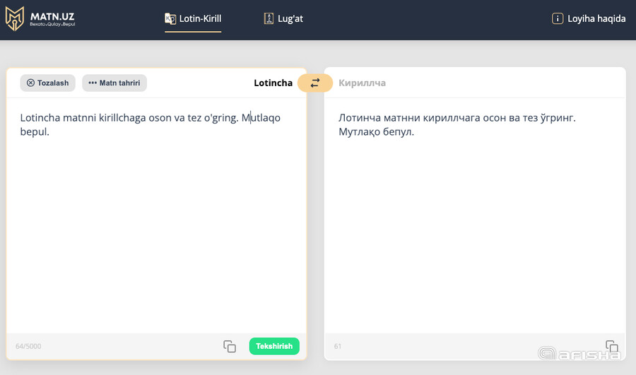 Oʻzbek tilidagi yana bir sifatli transliterator. “Matn.uz” mutlaqo bepul va hech qanday cheklov mavjud emas. Unda kunlik emas, birdaniga 5000 ta soʻz kiritishingiz mumkin. U matndagi xatolarni topib, toʻgʻri variantini tavsiya qiladi va lotindan kirillga va aksincha oʻgirib beradi.