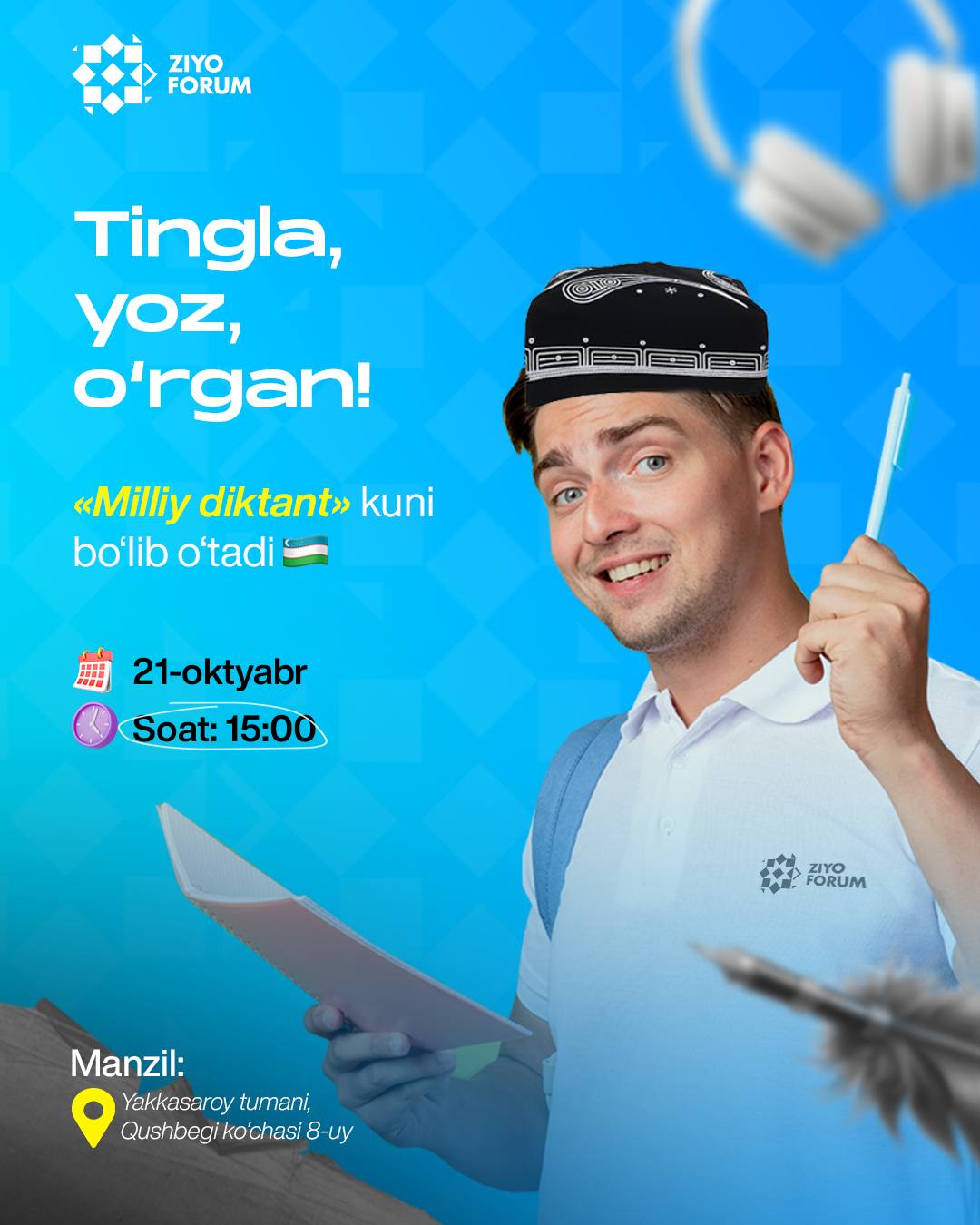 Ziyo Forum ilm-fan va ta’lim, tarbiyani rivojlantirish xalqaro fondi o‘quvchilar va yozma ifoda ko‘nikmasiga ega yoshlar uchun “Milliy diktant” kuni boʻlib oʻtadi.
