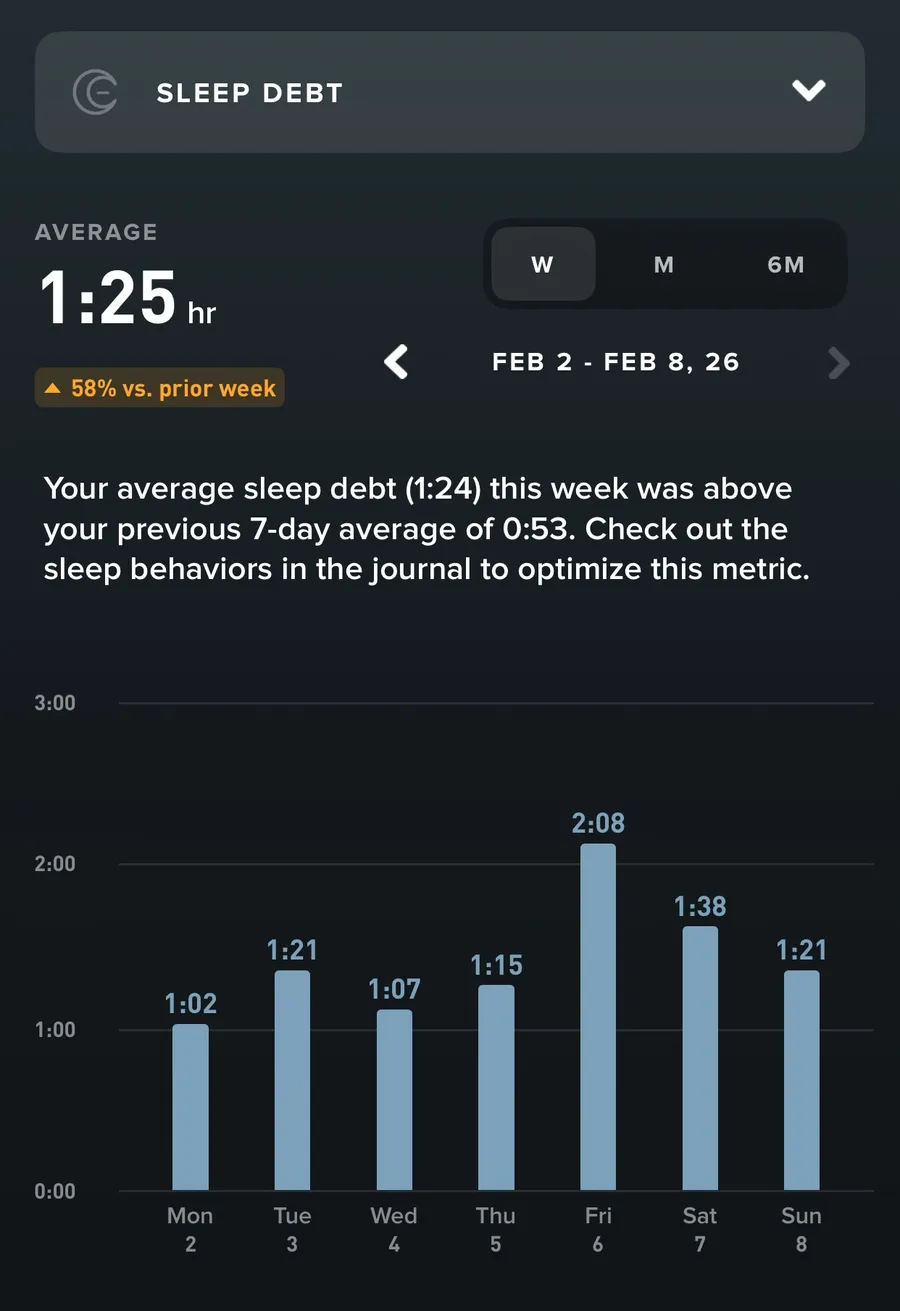 Hafta boshida ishdagi vazifalar va kechki mashg‘ulotlar sababli uyqu vaqtim qisqardi. Skrinshotda ko‘ringani kabi, uyqu qarzim (Sleep Debt) kun sayin oshib borgan. Dushanbadan boshlab qarz yig‘ilib bordi va juma kuniga kelib eng yuqori nuqtaga — 2 soat 8 daqiqaga yetdi. Ushbu haftada mening o‘rtacha uyqu qarzim 1 soat 25 daqiqani tashkil qildi.